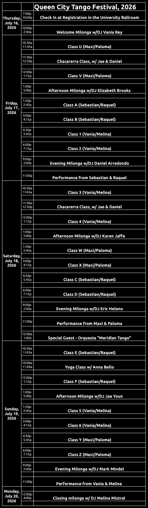 | 10:00p- 2:00a | Welcome Milonga w/DJ Vania Rey | |||